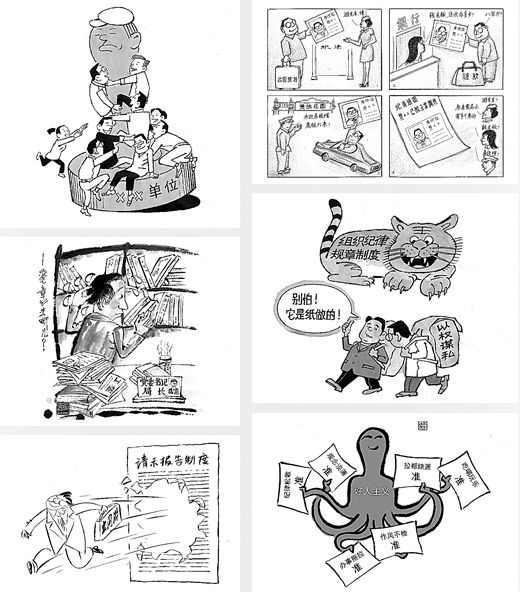 本報北京6月6日電。ㄓ浾呤⑷粑担5月19日,中央紀(jì)委監(jiān)察部網(wǎng)站推出《網(wǎng)友揭 漫畫“說” 黨員干部“組織渙散 紀(jì)律松弛”現(xiàn)象(之一)》,摘發(fā)了部分網(wǎng)友精彩留言,并以漫畫形式曬出8類黨員干部“組織渙散、紀(jì)律松弛”的現(xiàn)象。報道受到媒體和網(wǎng)友的好評。連日來,廣大網(wǎng)友熱情參與,繼續(xù)揭露“組織渙散、紀(jì)律松弛”的種種表現(xiàn),中央紀(jì)委監(jiān)察部網(wǎng)站6月6日凌晨推出第二批根據(jù)網(wǎng)友精彩留言創(chuàng)作的漫畫作品。