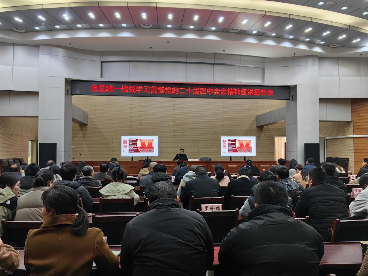 報(bào)告會(huì)上,胡樹青圍繞學(xué)習(xí)貫徹習(xí)近平總書記在黨的二十屆四中全會(huì)上的重要講話精神和全會(huì)《建議》,系統(tǒng)解讀了全會(huì)召開的重要意義、“十五五”時(shí)期的重要地位,以及經(jīng)濟(jì)社會(huì)發(fā)展的指導(dǎo)方針、主要目標(biāo)、戰(zhàn)略任務(wù)和重大舉措,并結(jié)合全區(qū)統(tǒng)一戰(zhàn)線工作實(shí)際,強(qiáng)調(diào)要提高政治站位,自覺將學(xué)習(xí)貫徹全會(huì)精神與服務(wù)中心大局緊密結(jié)合,切實(shí)把思想和行動(dòng)統(tǒng)一到全會(huì)精神上來。要全面宣傳宣講,在統(tǒng)戰(zhàn)各領(lǐng)域開展專題學(xué)習(xí),掀起學(xué)習(xí)宣傳貫徹全會(huì)精神的熱潮,匯聚廣泛共識(shí)和奮進(jìn)動(dòng)力。要聚焦實(shí)干實(shí)效,把貫徹落實(shí)全會(huì)精神體現(xiàn)到扎實(shí)做好當(dāng)前各項(xiàng)工作上,找準(zhǔn)“十五五”規(guī)劃的結(jié)合點(diǎn)和發(fā)力點(diǎn),發(fā)揮統(tǒng)戰(zhàn)獨(dú)特優(yōu)勢(shì),展現(xiàn)更大統(tǒng)戰(zhàn)作為。