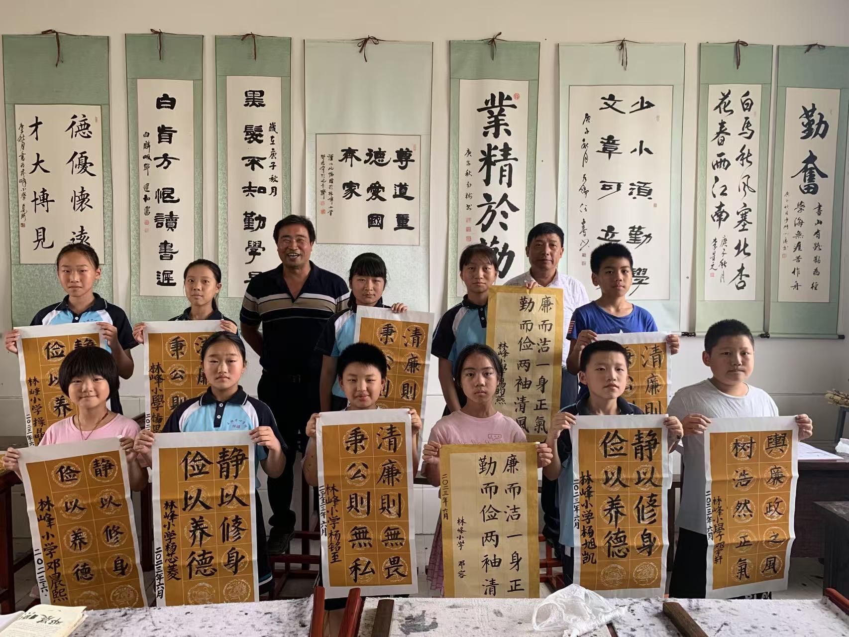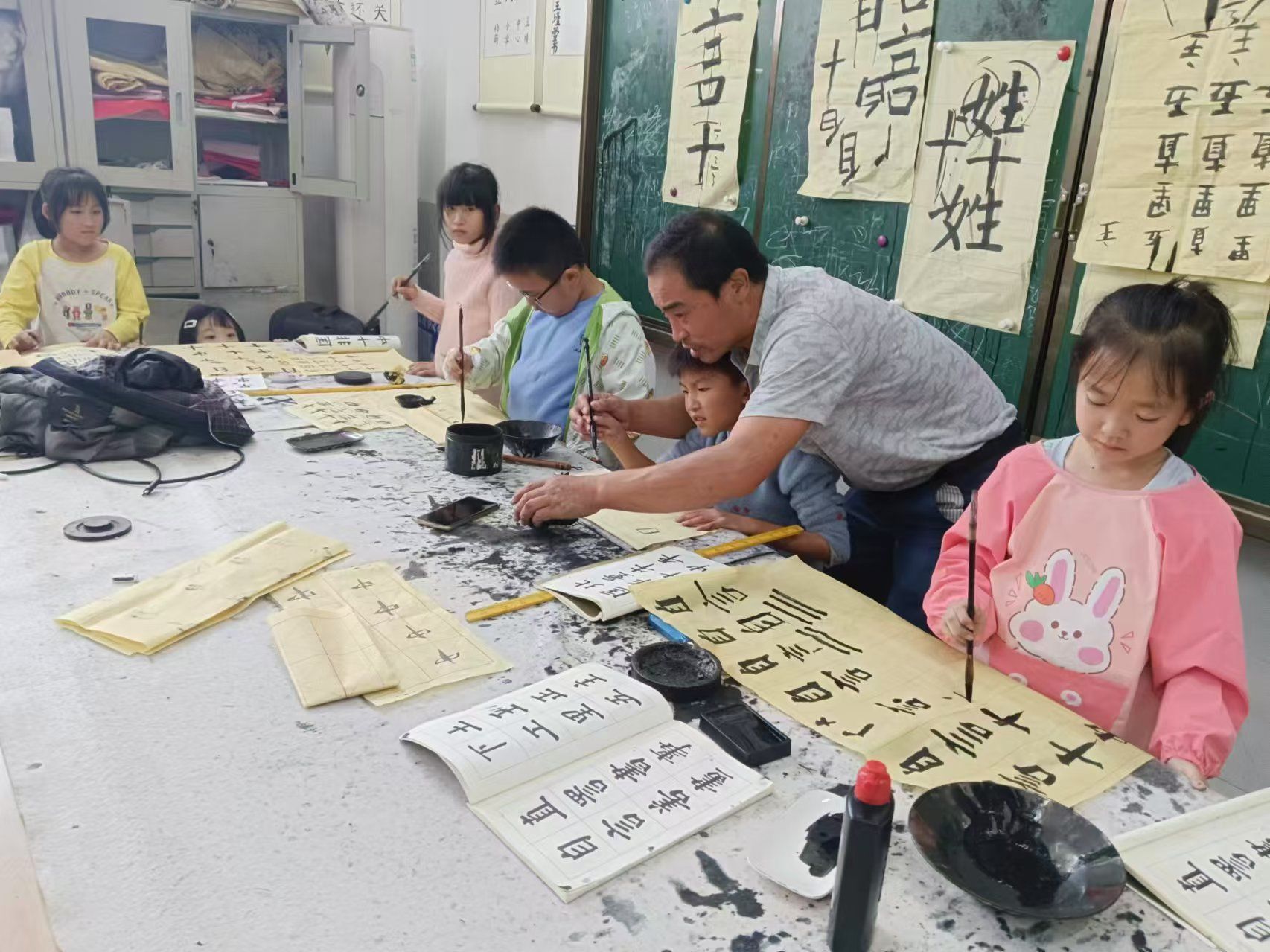 他的書法課堂,不拘泥于五橫中心學(xué)校的“課后服務(wù)”。村部的會議室里,有他授課的身影;農(nóng)戶家的堂屋中,回蕩著他的教誨聲;哪怕只是樹蔭下擺上幾張課桌,那也能成為他的“講臺”。夏日里,他教孩子們誦讀《弟子規(guī)》,每一個字都念得鏗鏘有力。汗水從他的鬢角滑落,滴在宣紙上,變成朵朵墨花。孩子們看著墨花笑了起來,他也跟著笑了,那笑容里滿是欣慰與滿足。